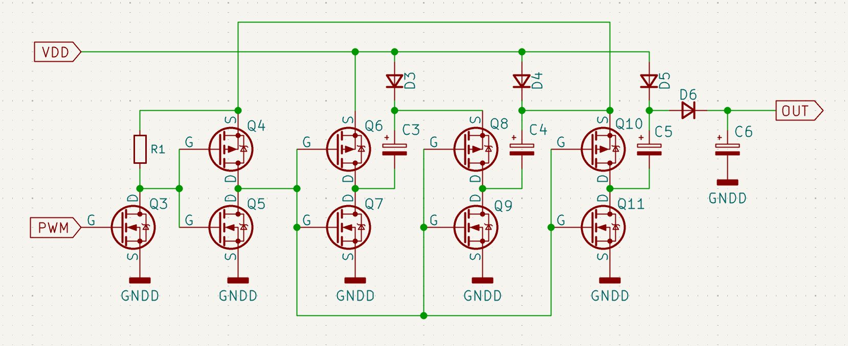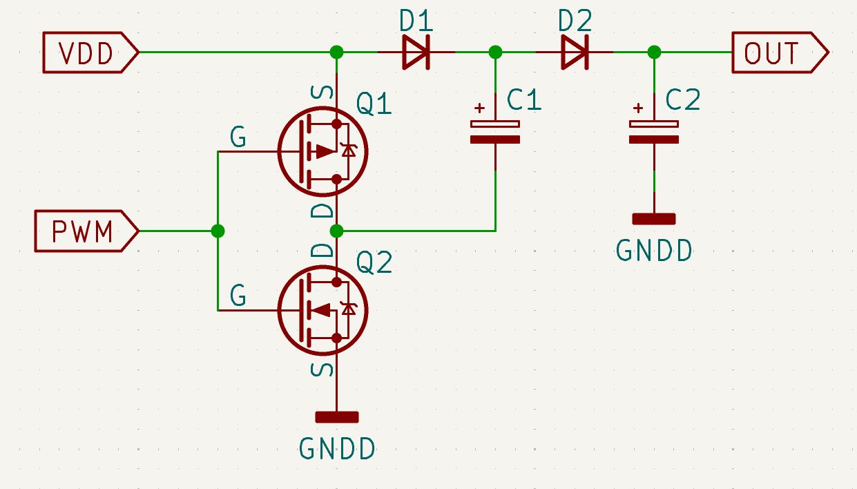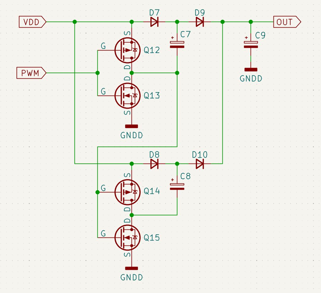 C7/C8が交互に充電/放電を行う回路。放電が途切れないので効率よさげ。但し、PWMデューティは50%固定にする必要あり。