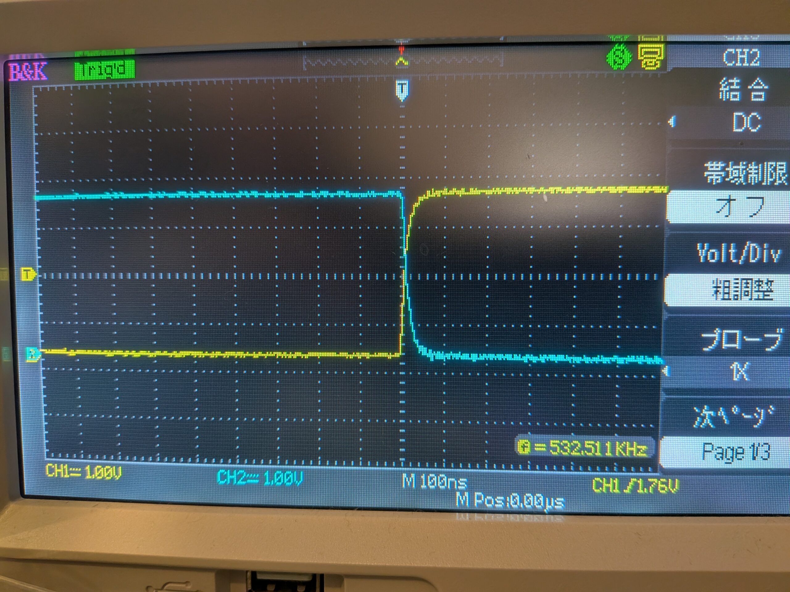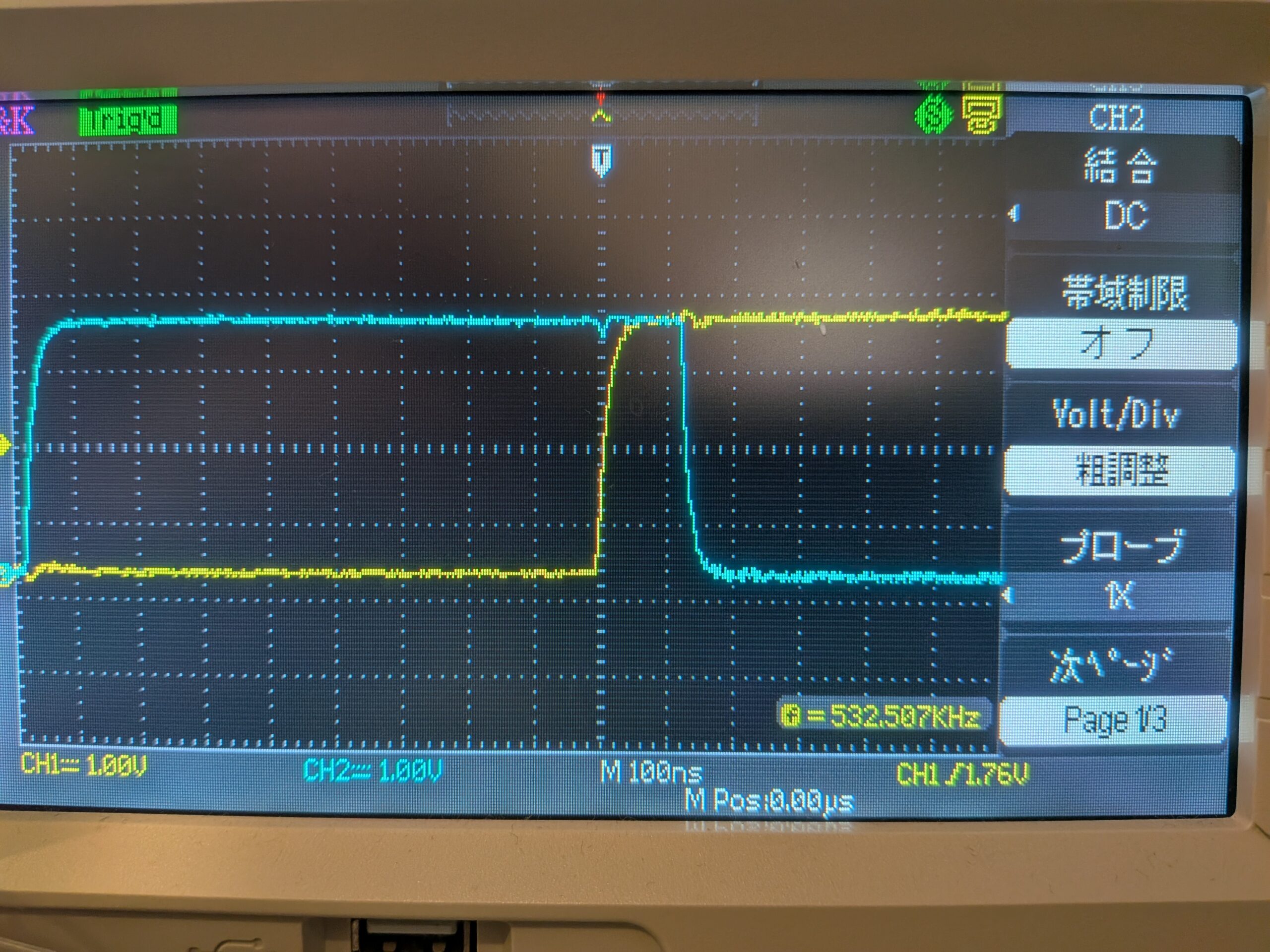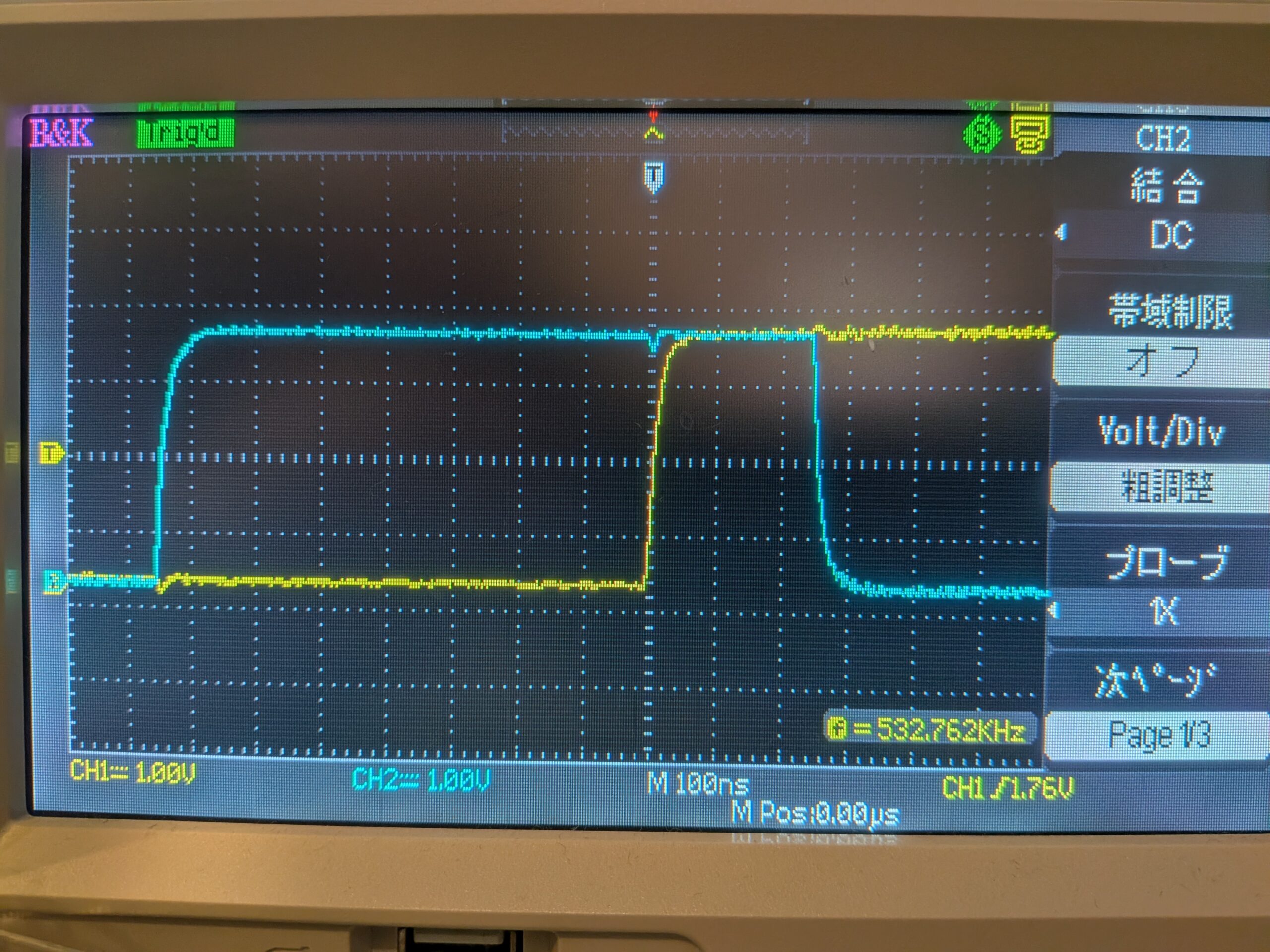 下記は、16MHzクロックでTCA0-WO0出力(黄色)をCCLで反転出力(水色)してみた結果。