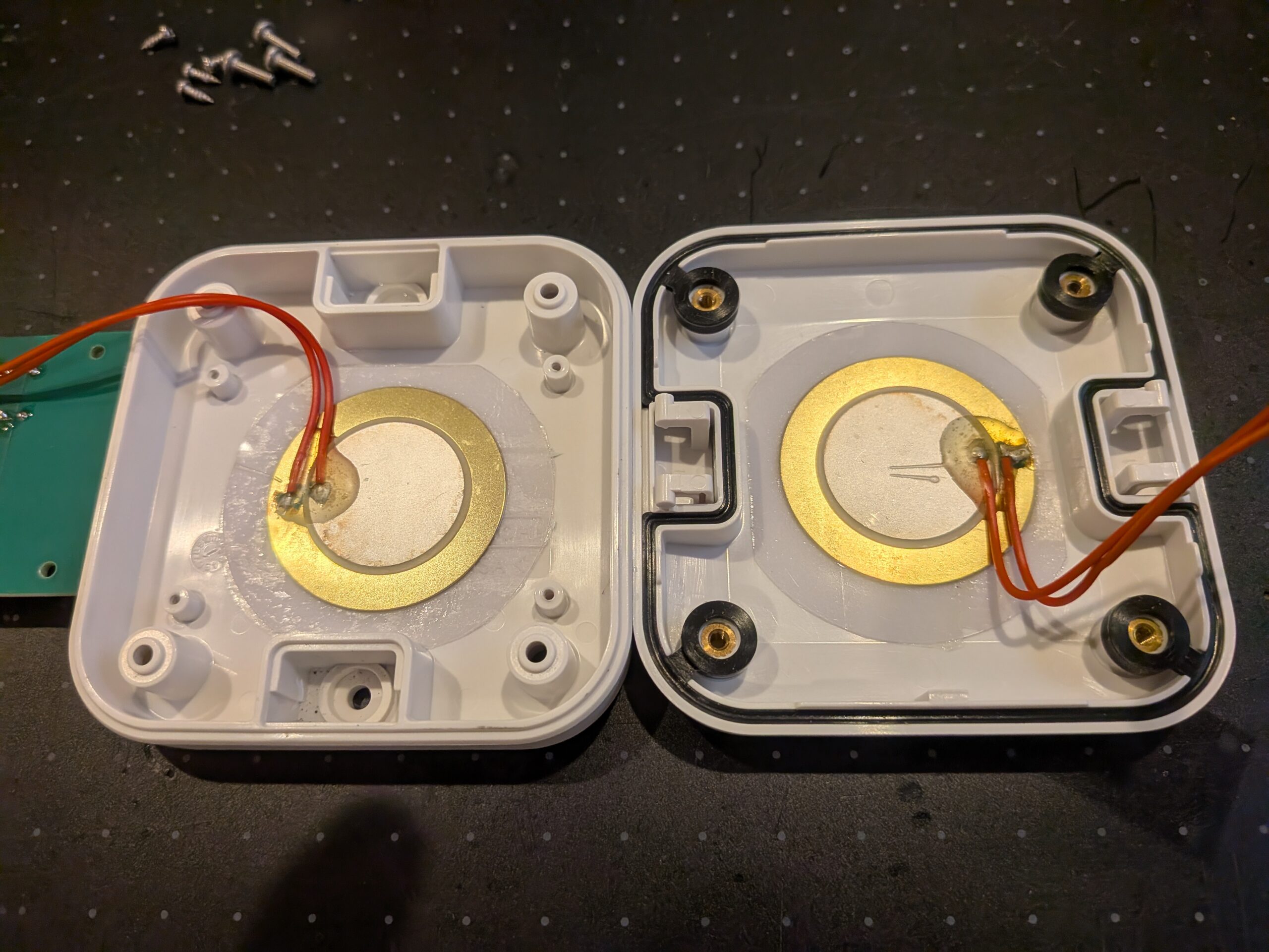 たまになのでそう気にはならないが雨降ってないのにときどき環境音(近所のバイクの音)で反応する。感度を落とさずになんとかならないかと実験的にピエゾセンサーをボックスの底にも追加してみた。